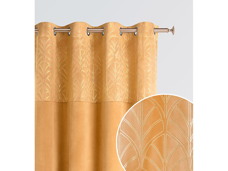 Jednoduchý štýlový záves v horčicový farbe. Má matný povrch, je vyrobený  z kvalitného zamatu. Zabezpečí zatienenie a zníži intenzitu svetla vo Vašej domácnosti. Na hornom okraji je opatrený kovovými očkami, pomocou ktorých sa upevní na závesovú tyč.