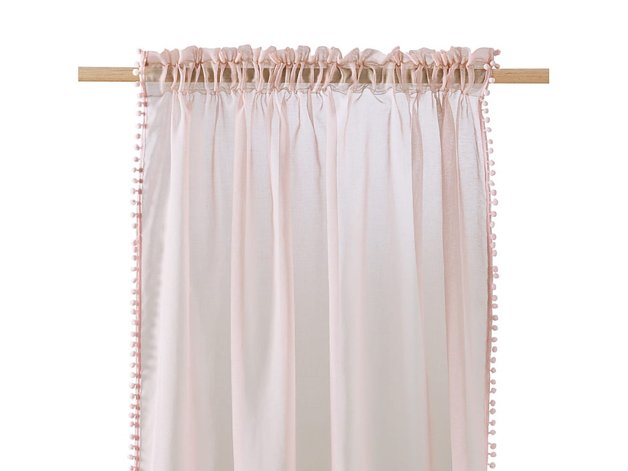 Elegantná svetlo-ružová záclona s pom-pom bombrlcami po okrajoch. Rozmer záclony Malia je 140x250cm.